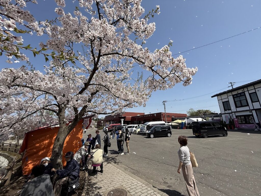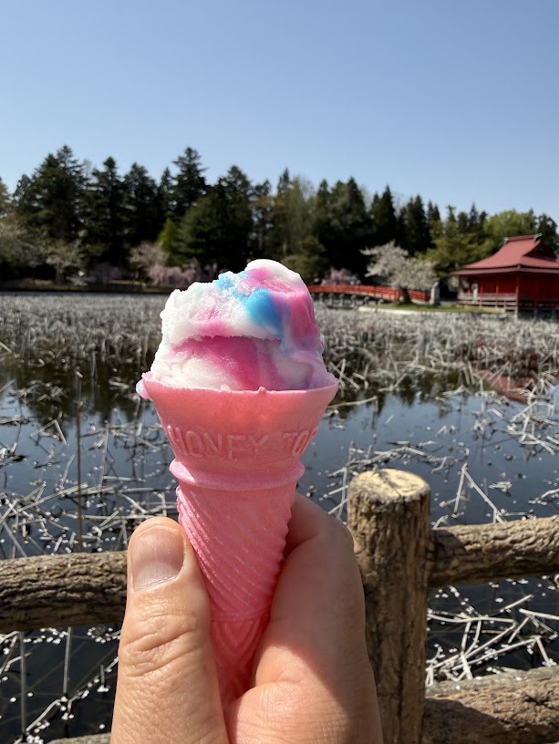 食後にはデザートが必須。アイスクリーム屋さんがあったので1つ購入。価格は200円。子供のころは100円だったなと思いつつ、あれから時間が流れて価格は2倍になっている現実。ちりんちりんアイスとかチンチンアイスとか秋田では ババヘラアイスとか呼ばれてますが要はシャーベットっぽいさっぱしたアイスクリーム。 なんだか派手な色合いが今風なのか? 桜が舞い散る中、美味しくいただきました。