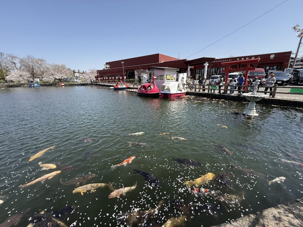猿賀公園にある池にはたくさんの鯉が泳いでいます。餌の自販機があり100円で餌を購入して一掴み池に放り投げると、たちまち色とりどりの鯉たちが集まってきます。すべての鯉にいきわたる様に広範囲にえさを放り投げるのですが、それでも餌にありつけない鯉もいることでしょう。なんとも過酷な生存競争!
