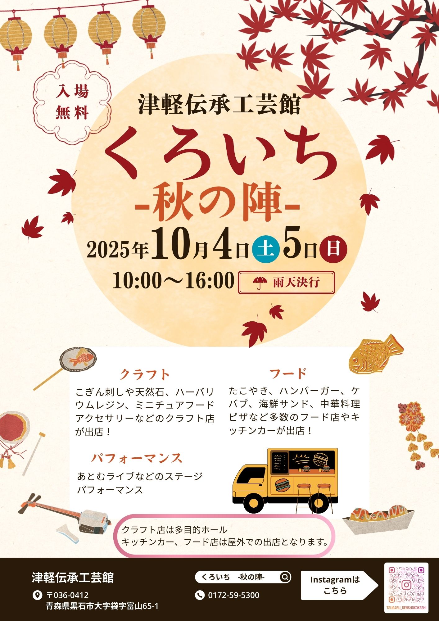 10月になりましたね。早いものです。秋の行楽シーズンなので週末には各地でイベントが開催されますが黒石市の津軽伝承工芸館でも「くろいち-秋の陣-」が開催されます。Asian.Leeもフード出店いたします。開催日は10/4(土)・5(日) の両日、時間は10時~16時までとなっております。